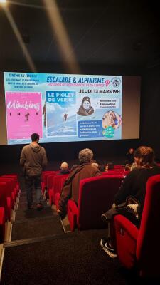 Pour cette occasion , le cinéma Megacastillet, a projeté « Le piolet de verre » documentaire réalisé par Amélie Mauro et traitant de l’aventure de Fabienne Sicot-Personnic ,de sa préparation jusqu’à l’ascension de l’Everest!! Nous avons été transportés dans cette aventure Une leçon de vie , de courage , de dépassement de soi face au handicap qui n’a laissé personne indifférent.Et cerise sur le gâteau: Fabienne était là!!Après la séance , elle a pu répondre à toutes nos questions autour d’un verre dans notre salle d’escalade et nous a fait découvrir son équipement. Tout le monde a passé un super moment entre partage et admiration!!