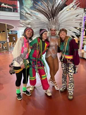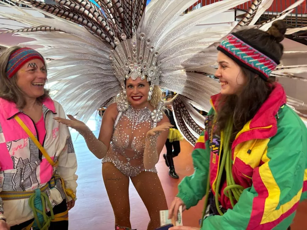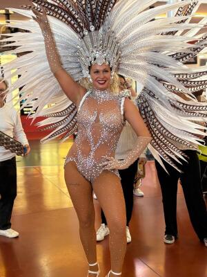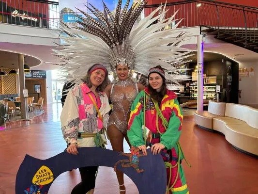 Une danseuse brésilienne, parée de paillettes et de plumes, a enflammé la scène du cinéma avec un show digne des plus grands carnavals. Ambiance festive garantie, rythmée par de superbes musiques brésiliennes ! 🎶💃