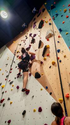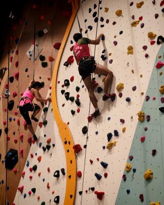 Les coureurs, vêtus de très élégantes tenues roses, se sont élancés sur les voies de la salle. Au total, 48 voies différentes étaient à parcourir sans relâche pendant 1h45.