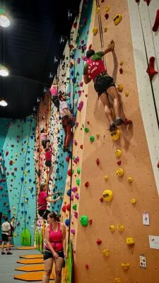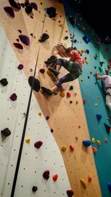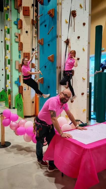Les coureurs, vêtus de très élégantes tenues roses, se sont élancés sur les voies de la salle. Au total, 48 voies différentes étaient à parcourir sans relâche pendant 1h45.