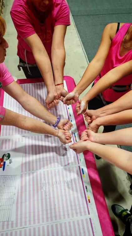 L’acharnement et l’énergie se sont fait ressentir jusqu’au bout — jusqu’à ne plus pouvoir tenir les prises ! Le coton rose totalement trempé des grimpeurs témoignait de l’effort fourni jusqu’à la dernière minute.